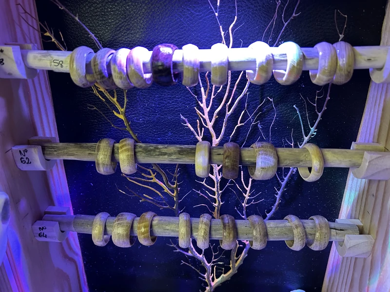 Bagues en 3 tailles : 58, 62 ou 64 - En acacia, chêne ou loupe d'orme - finition fond dur - 8 € l'unité